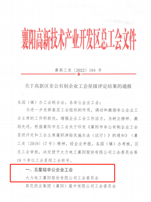 近日,由襄阳高新总工会评选的高新区非公有制企业工会星级评定结果出炉,经过系列考核、审核,大力电工襄阳股份有限公司工会委员会被授予襄阳高新区2022年度五星级企业工会荣誉称号!