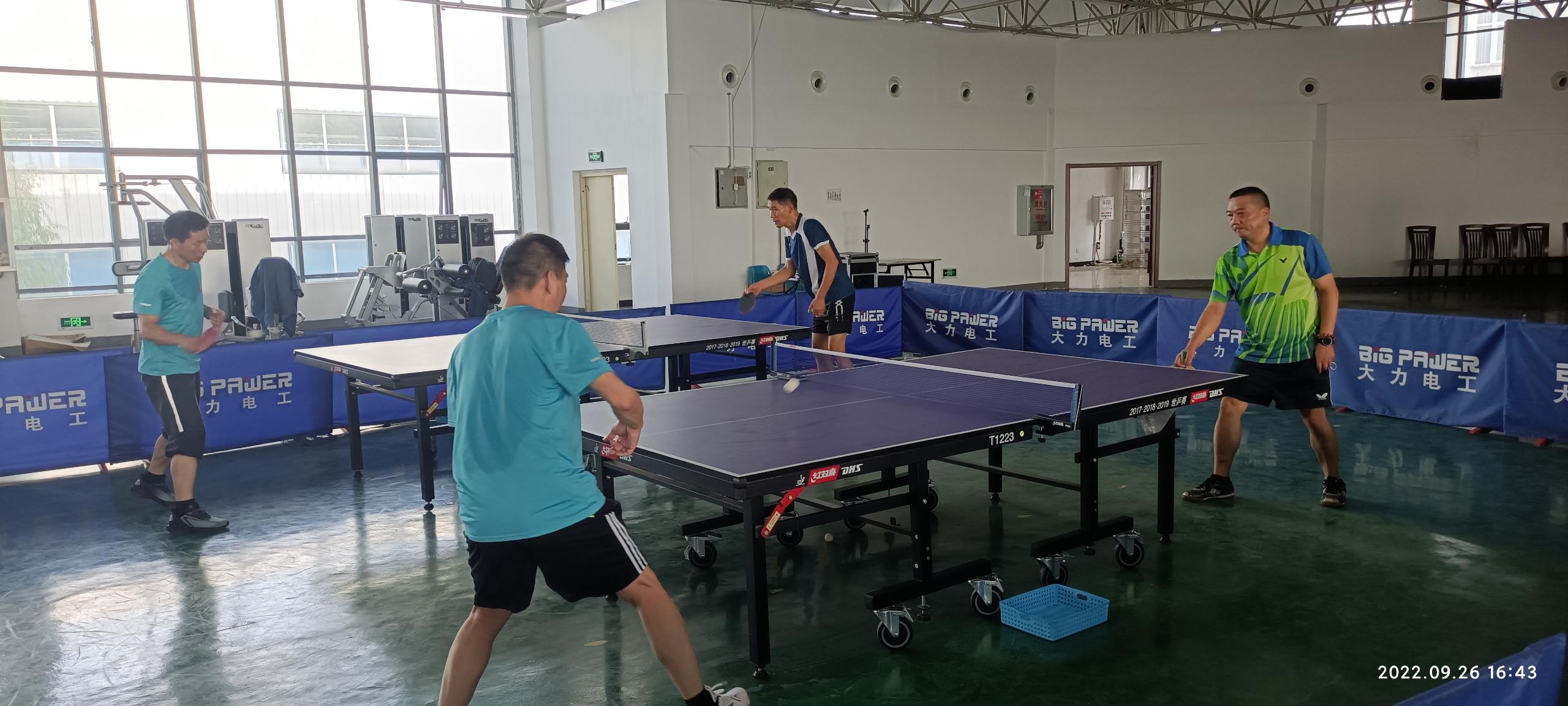 乒乓球作为一项常见的体育运动,能全面提高人体新陈代谢,增强体质,促进健康,是大众喜爱的一项目运动。大力电工乒乓球队成立于2019年,现有队员39人,随着公司的不断壮大,为了让员工更好地享受运动带来的健康和快乐,大力电工前后多次购置了乒乓球台,并划定乒乓球活动区域,乒乓球活动场所每日对员工开放,此举受到员工的喜爱和欢迎,同时,也吸引了各企事业单位乒乓球爱好者前来切磋球艺,不断促进企业间的合作和交流。